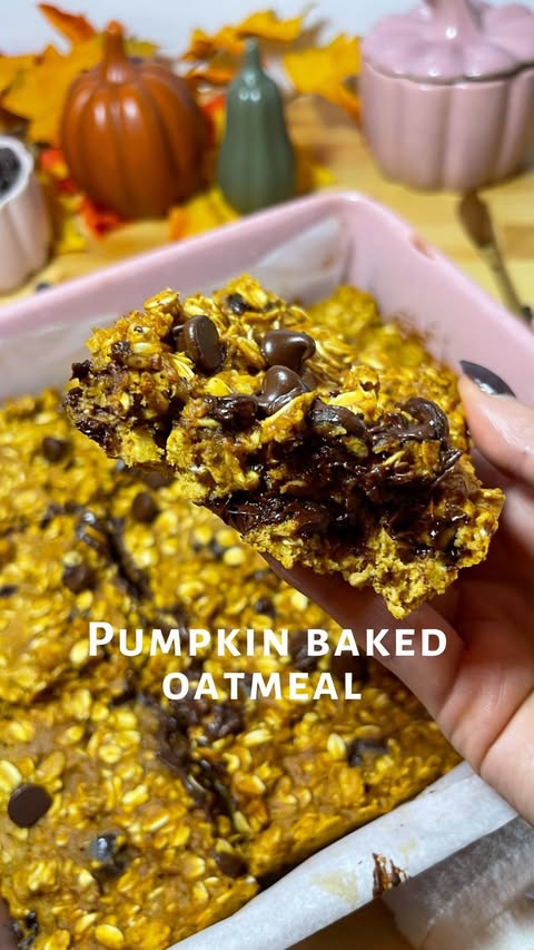 In a bowl, combine 1 cup pumpkin puree, 2 cups old fashioned oats, 2 scoops cinnamon protein powder, 1/4 cup nut butter, 1/4 cup maple syrup. Optionally add 1 tsp baking powder, 1 tsp cinnamon, 1 tsp pumpkin pie spice, & 1/2 cup chocolate chips. Once combined, pour into a lined baking dish and bake at 350°F for 10-12 minutes. Once cooked, slice and enjoy!View original recipe