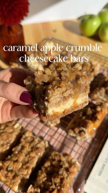 GRAHAM CRACKER CRUST: In a food processor (or blender) blend together 15 graham crackers, 1/2 cup melted unsalted butter, & 1/4 cup granulated sugar. Firmly press this into a lined 13x9 baking dish. CHEESECAKE: In a stand mixer, beat together 24 oz room temperature cream cheese with 1 cup granulated sugar. Once combined, add in 3 eggs (one at a time) & 1 tbsp vanilla extract. Once smooth and silky, pour on top of your graham cracker crust. SPICED APPLE: Peel 3-4 Granny Smith apples (I did 4 small ones) & use the full star chopper to chop up your apples. Then toss in 2 tbsp granulated sugar, 1/2 tsp cinnamon, & 1/2 tsp pumpkin pie spice. Sprinkle on top of the cheesecake. CRUMBLE: Combine 1/2 cup melted unsalted butter, 1 cup flour, 1 cup brown sugar, 1/2 cup old fashioned oats, & 1 tsp cinnamon. Sprinkle on top of the apple pieces. Bake at 350°F for 45-50 mins. Once the pan is cooked, transfer to the fridge for 2 hours before slicing. Slice into 16 pieces and ENJOY!!View original recipe